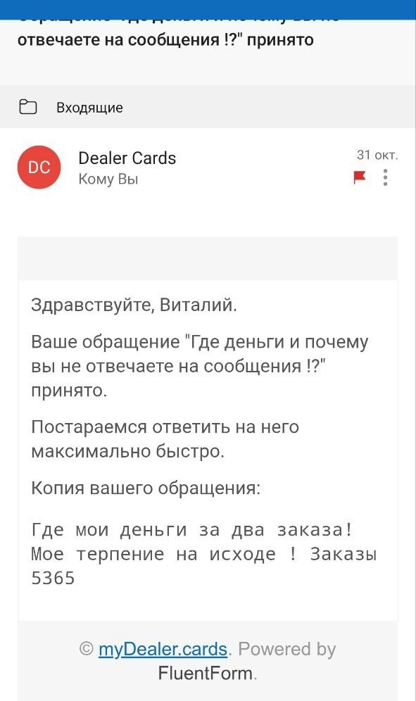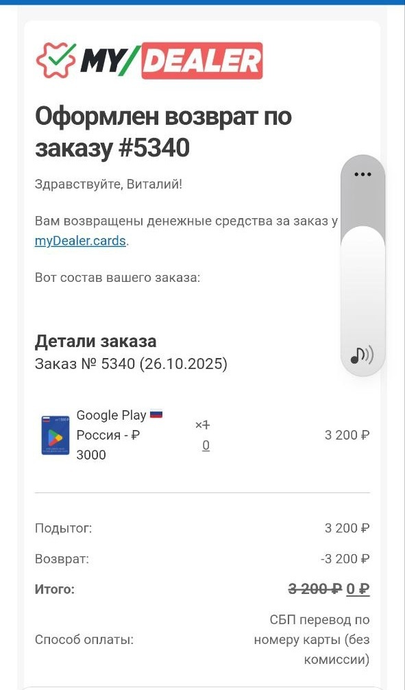 Итак, первый свой пост я хочу посвятить тому, как я попался на уловку мошенников. 26.10.25 дочка попросила оплатить пару скинов в игре Роблокс. Телефон у нее на Андроиде. Начал смотреть, как пополнять кошелёк в Google Play, и наткнулся на ребят mydealer.cards. С первого взгляда сайт как сайт, пополняют кошельки на все консоли и современные онлайн-сервисы. Ну и я решился купить карту для пополнения счета в плей маркете. Оплатил, через какое то время пришел код и я попытался его использовать, но столкнулся с проблемой, гугл плей-код не принимал. Начал писать в поддержку order@mydealer.cards и параллельно подозревать, что кажись я лоханулся и дочери не видать сегодня скинов в роблоксе и мне моих денег. Но тех поддержка ответив через какое-то время, начало плести что то про аварийные работы и вообще возврат оформлен, ждите! Но уже прошло 1.5 недели, возврата нет. Тех поддержка молчит. Порылся в интернете и нашел еще одного бедолагу как и я сделавший покупку у данных уродов! Попытаюсь накатать заявление в полицию и в остальные инстанции.