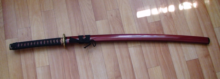 Но в моем случае страдания с японским оружием, трудности возникли, не когда изготавливал клинок, а когда необходима была фурнитура меча( фути, кошира, менуки) и шнур обмотки ( ито). Обратился на доступный интернет магазин, в котором мне доступно объяснили, что продают товар только по России. Нашел другой сайт, там за пересыл запросили сумму равную заказу. Конечно, можно было заказать непосредственно в Японии, но там цены...мама не горюй. Потом возникали трудности с переводом денег, потому что курс постоянно рос, и был шанс , что продавец получит на момент получения денег меньше, чем отправлялось. Поэтому нашел другой способ, как перевести деньги. Купил китайскую сувенирную катану, чтобы её ножны использовать для своей. Правда, вставку пластмассовую из кои-гути ( рот карпа) , устье ножен пришлось выкинуть, и клинок несколько болтается внутри как погремушка, но выглядит неплохо, цельным, словно для этой катаны и сделан. .