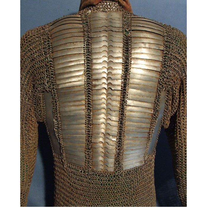 А на Востоке усилением кольчуги стал кольчато-пластинчатый доспех, сочетавший гибкость и прочность. Например, бахтерец из узких мелких пластин.