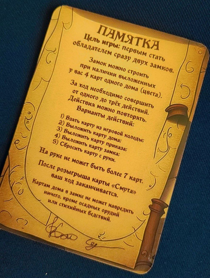 Цель игры - построить минимум 2 Замка в личной игровой зоне. Что бы сделать это, вам нужно собрать Дом из 4-х одноцветных персонажей. Персонажи здесь - карты Дома 5-ти цветов - влиятельные и не очень персоны, в одинаковом наборе для каждого (эффекты карт описаны выше).
