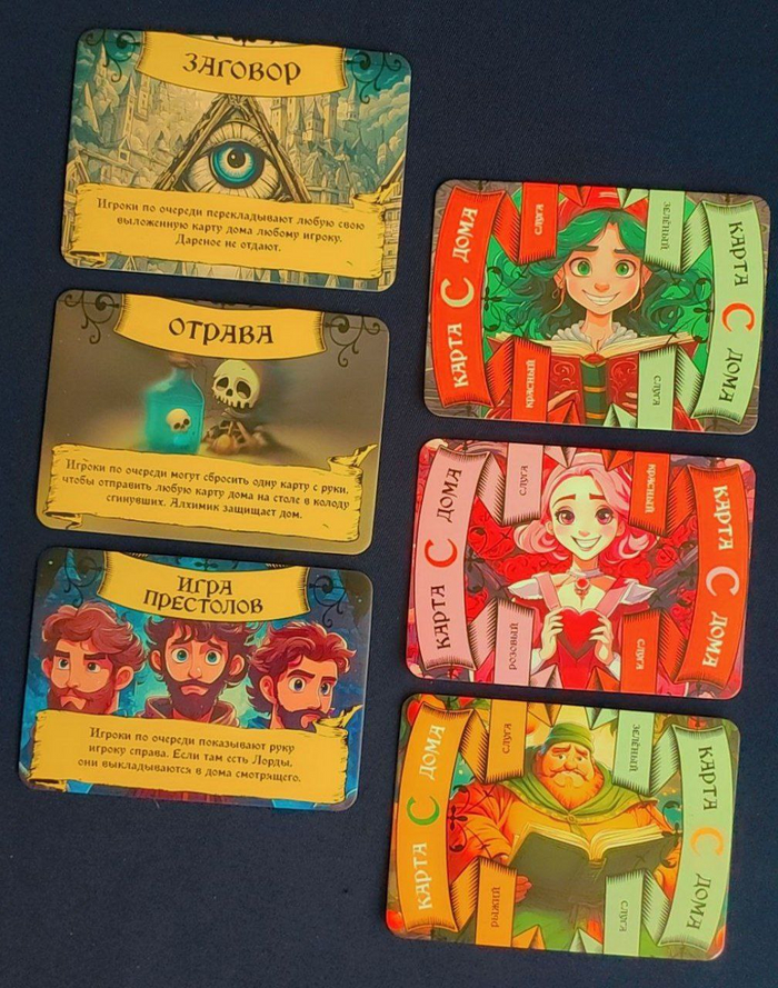 Также в игре есть карты Слуг, имеющие прямое отношения к домам и располагающиеся в них же, которых можно разместить в одном из двух домов, указанных на карте цветов, на выбор.