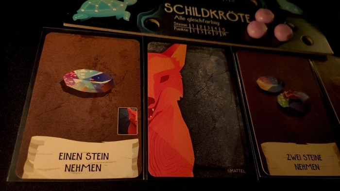 1) Возьмите один камень: в распоряжении игрока две таких карты, и каждая позволяет ему взять только один камень из чаши, сразу же разместив его на личном планшете. С обратной стороны таких карт изображены половинки койота. Как только обе карты будут перевёрнуты лицом вниз, игрок может активировать Койота (об этом ниже)