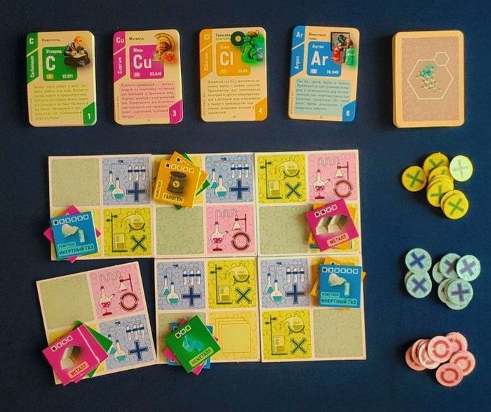 В игре вы найдёте тайлы четырех цветов: Зелёный, Розовый, Синий и Жёлтый. На протяжении всей игры вам предстоит собирать подобные по цвету (соответственно и по группе химических элементов) картонные квадратики в цепочки змейкой, но исключительно ортогонально (по диагонали не считается), с целью получения карт с победными очками (чем больше победных очков принесёт карта, тем она дороже).