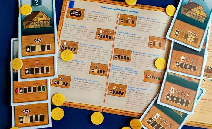 2) Проверка бронирования. Переверните все карты Гостей у первой гостиницы лицом вверх. Сначала разыгрываются эффекты карт, лежащих подле Чёрного хода, справа налево от гостиницы и только затем проверьте, кто же из гостей сможет получить место для ночлега. Для начала нужно сверить Приоритет (полученный благодаря способностям определённых карт Гостей, либо благодаря особенностям расселения конкретной гостиницы). Гости, обладающие Приоритетом, заселяются в первую очередь. Остальные же - начиная с ближайшей ко входу гостиницы карты с наибольшим количеством гостей.