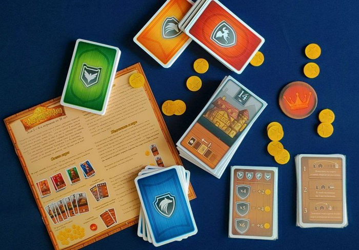 1) Карты Гостей (Четыре колоды по 24 карты четырёх цветов) представителей разных семейств с различными гербами.
