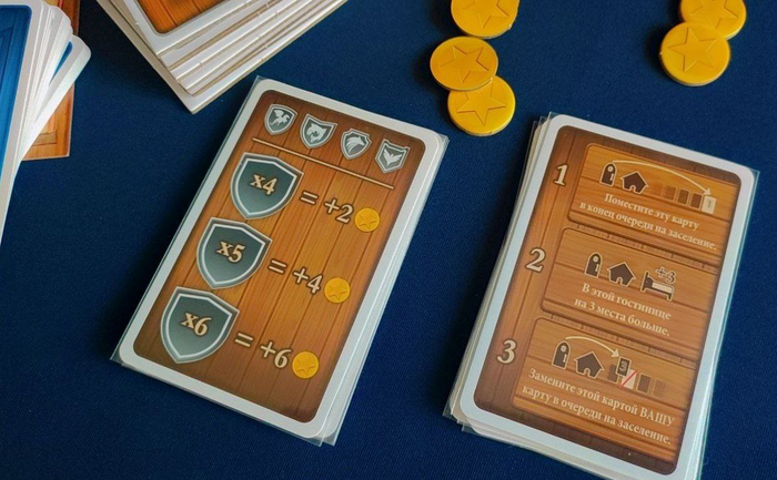 Необходимо отслеживать число Вместимости гостиницы: каждая заселённая карта Гостя будет уменьшать его на своё значение. Если какой-либо карте уже не хватает места в гостинице, она уходит из игры и вы переходите к следующей очереди в Гостиницу (ниже).
