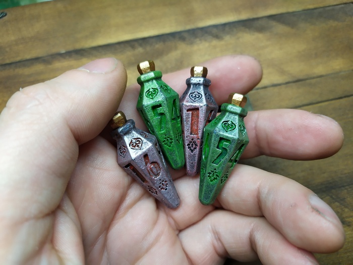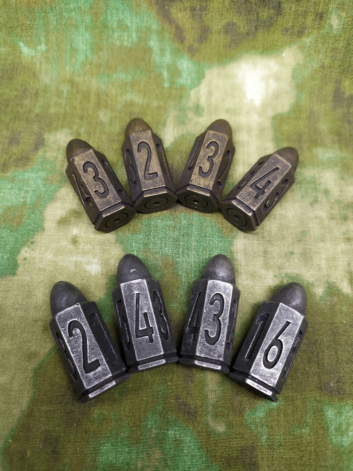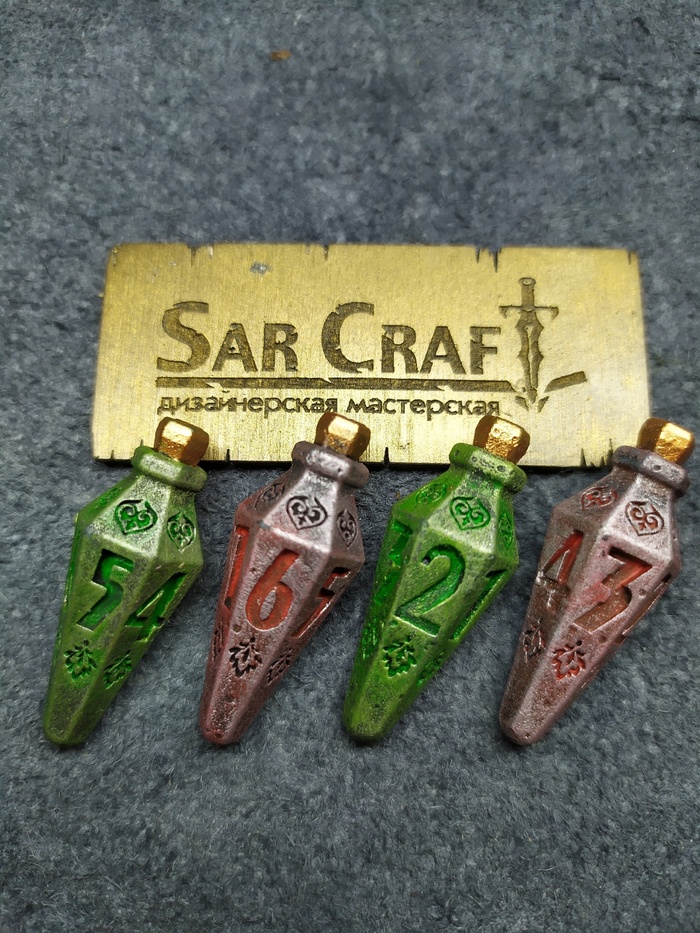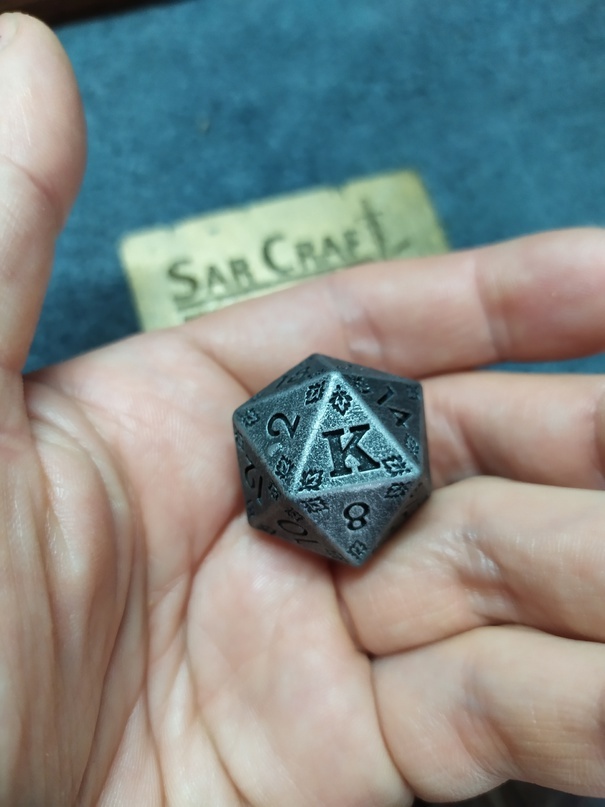 Поскольку я больше крафтер чем ролевк, я люблю создавать вещи. И почему бы мне не сделать оригинальные дайсы, подумал я, и сделал. Дайс D20 (с К (крит) вместо 20ки), Дайсы Пули D6 и дайсы Бутыльки Зелья (для здоровья и ещё чего-нибудь). Моделирование с нуля в blender, печать фотополимером. Так же в работе и другие дайсы. Очень приятны на ощупь по весу, хорошо кидаются.