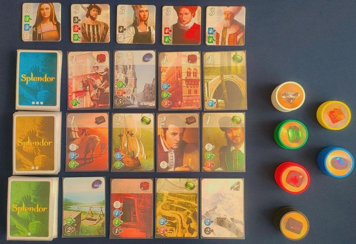 Разделите жетоны Драгоценностей по цветам и разложите их стопочками в игровой зоне. Карты трёх уровней разделите по цветам рубашек на три колоды и перетасуйте каждую. Расположив их друг над другом от первой до третьей (снизу вверх), выложите в ряд по 4 карты из каждой колоды так, что бы образовалась сетка 3х4. После этого над игровой зоной случайно расположите такое количество тайлов Вельмож, сколько игроков за столом +1.