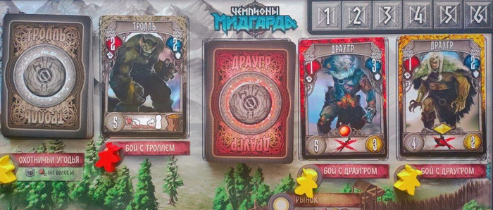 Что делает этот выбор действительно интересным, так это тот факт, что каждый из вариантов противников предлагает разные награды (и, возможно, штрафы, если никто не победит тролля). Драугры, как правило, предлагают немного славы и немного золота в случае победы, но часто несут игроку и довольно низкий риск поражения. Мифические монстры намного жестче, но предлагают большие награды. Тролли, как правило, приносят мало славы и дерева в случае победы, но они также позволяют игроку сбросить один из своих жетонов Позора (если они у него есть) и выдать такой жетон другому игроку на выбор. Жетоны Позора уменьшают завоёванную Славу (победные очки) в конце игры, поэтому необходимо отыскать хороший баланс между погоней за высоким риском, большими наградами и управлением жетонами Позора.
