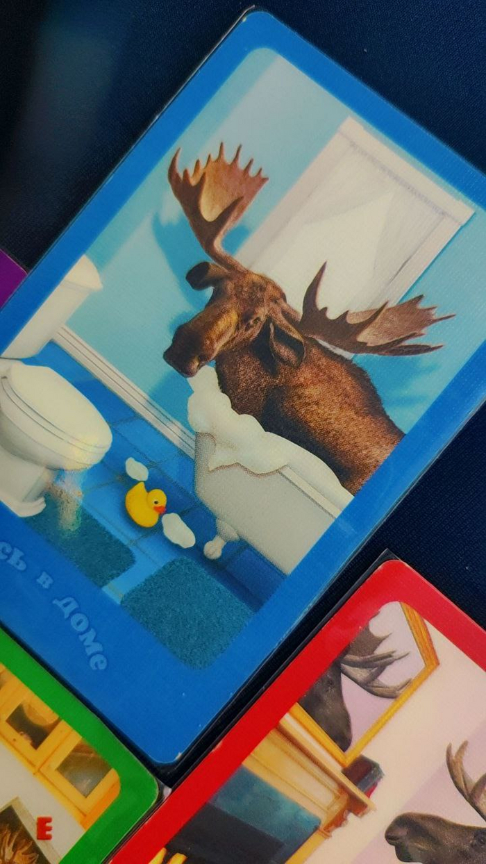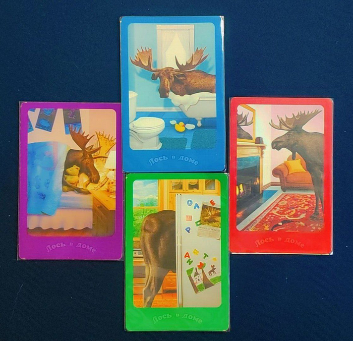 Лось в доме! - карточки с изображением лося, входящего в парадную дверь.