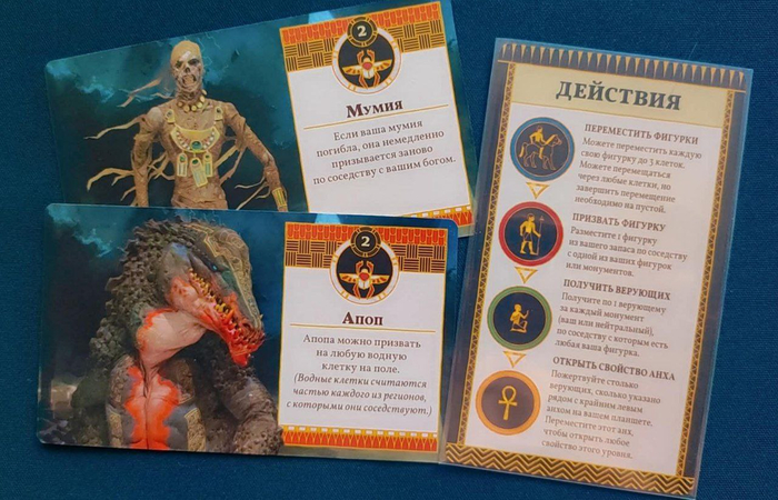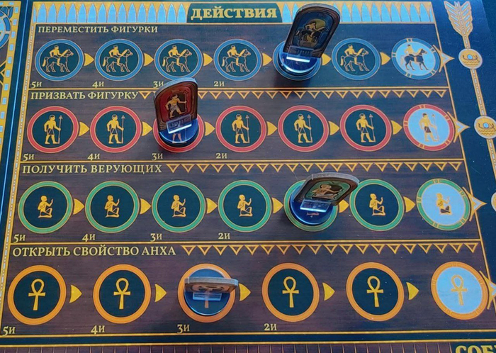 В фазе Действий игроки осуществляют перемещение своих воинов по игровому полю и захват территорий; получают верующих и прокачивают личный планшет, открывая свойства Анха.