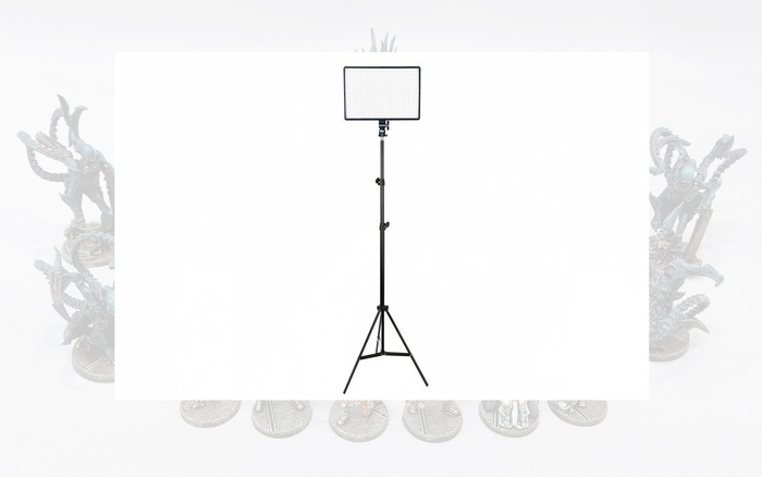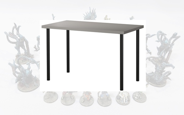 В качестве рабочей поверхности сгодится простой прямоугольный стол стандартной высоты. Я использую стол из Икеи с поверхностью нейтрального тёмно-серого цвета с регулируемыми ножками. Размера поверхности в 100х60 сантиметров теоретически должно хватить, но слишком много места не бывает. Мне помогает широкий подоконник, вплотную примыкающий к столу справа и полки, прикрученные к стене над столом, на которые можно ставить подносы с миниатюрами разной степени готовности. Подумайте о защите стены за столом от случайных брызг