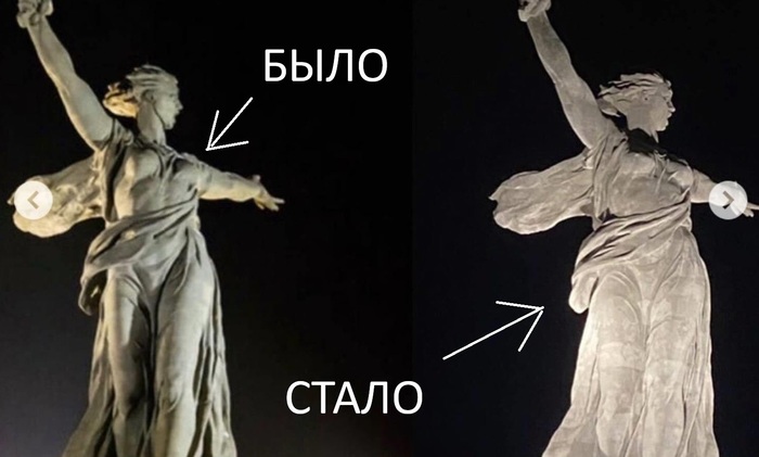 Кстати: а вот вам пример испорченного освещения, новая версия подсветки статуи Родина-Мать в Волгограде. Поотрывать бы им руки