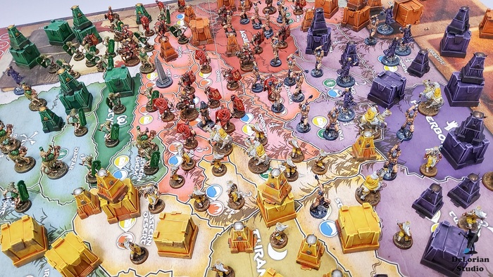 Помимо контроля территорий и развития движка, игра насыщена различными стратегическими решениями, проистекающими из системы эффектов разыгрываемых карт. Вы должны неустанно следить за действиями соперников, предвидеть их ходы и корректировать свою стратегию. Эффекты некоторых карт вносят элемент неожиданности и заставляют игроков постоянно адаптироваться к изменяющимся условиям игры. Например, внезапное Наводнение может затопить регион, что приведёт к потерям вашего контроля над ним и потребует переосмысления стратегии. Всё это не только добавляет некоторого драматизма в партии, но и заставляет игроков быть гибкими и адаптироваться к постоянно изменяющейся ситуации.