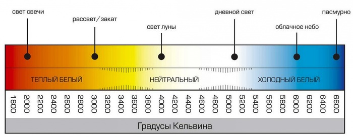 Есть такой показатель, как цветовая температура. Она измеряется в Кельвинах и отвечает за видимую теплоту излучаемого света. Температура в диапазоне 2700-3000К дают тёплый желтоватый цвет, тот самый, которым раньше светили лампочки накаливания. Нейтральный, белый цвет имеет температуру примерно на уровне 3500-5000К. Температура выше 5000К – это холодный, синеватый цвет