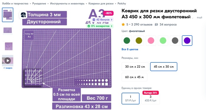 Нужно ли класть на поверхность стола специальный коврик? Я обхожусь без него. При наличии хорошего очищающего средства, загрязнение стола разноцветными пятнами не является проблемой. Очищаю поверхность примерно раз в полтора месяца. С другой стороны, коврик всё же проще постирать или заменить, поэтому выбор за вами. Есть специальные фирменные покрытия, но можно купить вот такой «коврик для резки» на том же Озоне: