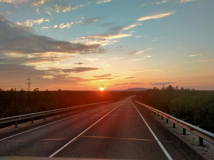 И после пересечения границы Карелии и Мурманской области стало немного не понятно. Так называемые и привычные белые ночи в Питере оказались совсем не белыми ночами. Хотя,для меня живущего в Питере это свой шарм. Но там солнце не собиралось уходить за горизонт. На фото 1:30.