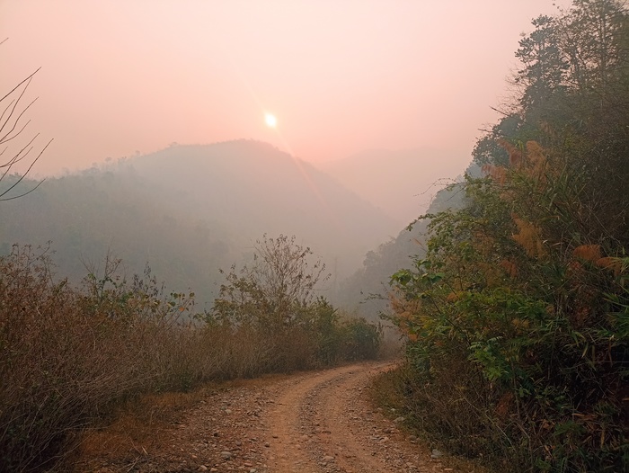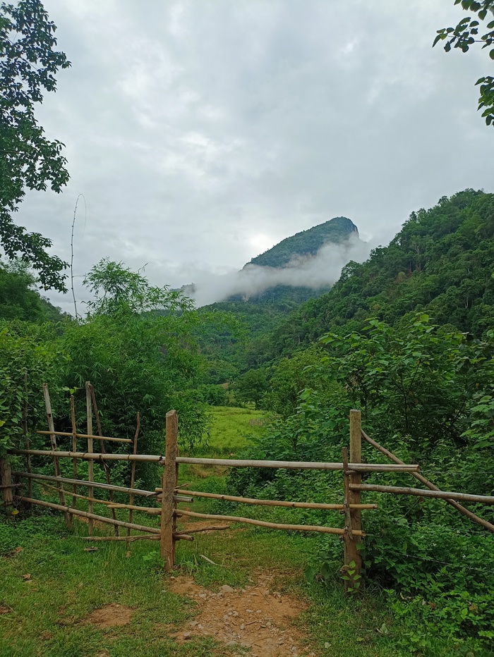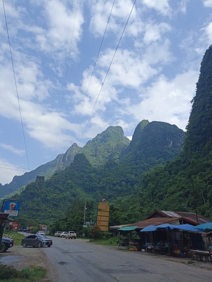 Примерно в 100 км от ЛуангПрабанга дорога проходит через горный перевал. До него дорога относительно нормальная, с ожидаемым для Лаоса количеством ям и ухабов. На перевале есть смотровая площадка, кофейня и магазинчики. Я сделал здесь остановку, чтобы пообедать и размять затёкшие члены, так сказать. Погода в этот день была довольно пасмурная, часто набегали облака. Но это было плюсом, потому что в такую погоду не жарко, а на перевале и вовсе прохладно. В какой-то момент я даже замёрз и одел куртку (ни разу не пожалел, что взял её с собой).