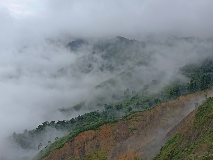 Сразу после этой смотровой площадки дорога пошла вниз. И вот здесь началась самая "жесть". На участке дороги в 200 метров асфальта нет совсем, сплошное грязевое месиво после дождя. Грузовики буксуют. Вдобавок всё вокруг заволокло туманом. Проехав ещё пару километров, я увидел впереди вереницу машин и байков, стоящих в ожидании. Остановился и тоже стал ждать. Ждали мы когда два экскаватора расчистят дорогу от осыпавшихся после сильного дождя камней и грязи. Длилось это добрых три часа. Я даже немного поспал.