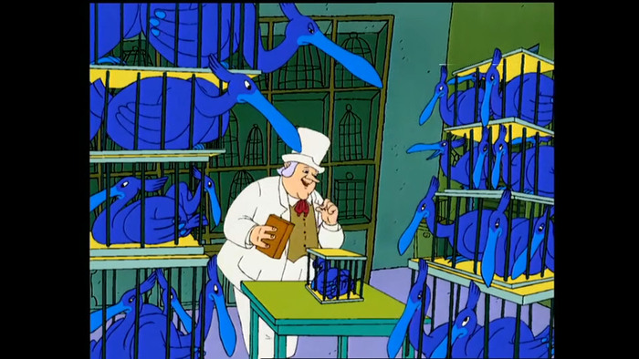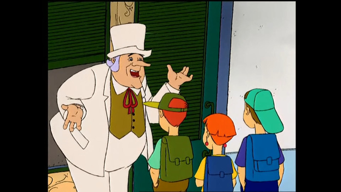 3) Мультсериал по книге Пьера Гриппари "Сказки улицы Брока" /"Les Contes de la Rue Brocca". Тут прямо один в один видно, что авторы вдохновлялись Пингвином из ДС при создании персонажа. Полный мужичок аристократичной внешности и пожилого возраста в цилиндре и фраке, только почему-то в белом костюме, вместо тёмного, однако если ему добавить ему ещё монокль и чёрный костюм, то будет один в один Освальд Кобблпот пожилого возраста. Только здесь его окружают не птицы, а птерозавры, летающие рептилоидные существа, хотя по идеи динозавры вымерли миллионы лет назад. Однако этот мужичок также антагонист и направляет птерозавров на людей, что бы отомстить им за какие-то личные унижения, на почве своей внешности и на почве унижений из-за того, что его все считали неудачником. Но в итоге птерозавры потеряли контроль и начали нападать на него самого и ему пришлось отпустить их с миром. Классическая история Освальда Кобблпота из ДС, который всегда был изгоем и подвергался насмешкам из-за внешности и длинного носа.