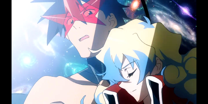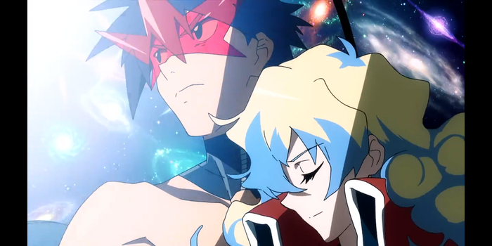 В "Гуррен Лаганн" главный герой и его девушка, тоже блондинка, в кабине меха. 27 серия, примерно 11:50.