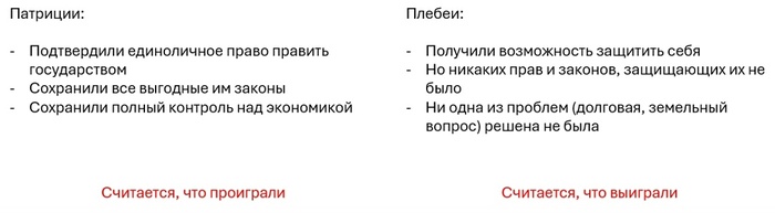Да и итоги всей этой движухи довольно занятные. Что получили плебеи от свержения децемвиров? Возврат к старым порядкам, только ставшим ещё хуже из-за принятия законов из последних двух таблиц. Что как-то не вяжется с тезисами об успехе сецессии.