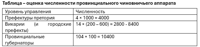 Необходимость прямого управления системой сбора налогов и, как следствие, рост числа судебных разбирательств, заставили увеличить и штат чиновников при офисе наместника. Если во 2 веке в среднем у каждого губернатора было два-три десятка подчиненных, то в 4 - около 100. При этом для контроля губернаторов, а также более эффективного управления ресурсами, провинции объединялись в диоцезы во главе с викариями, а диоцезы в префектуры. В империи было 14 викариев с 200 - 600 чиновниками у каждого и 4 префекта у каждого из которых до 1000 человек персонала [42: c. 205].