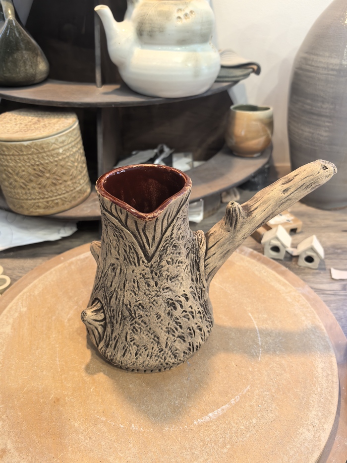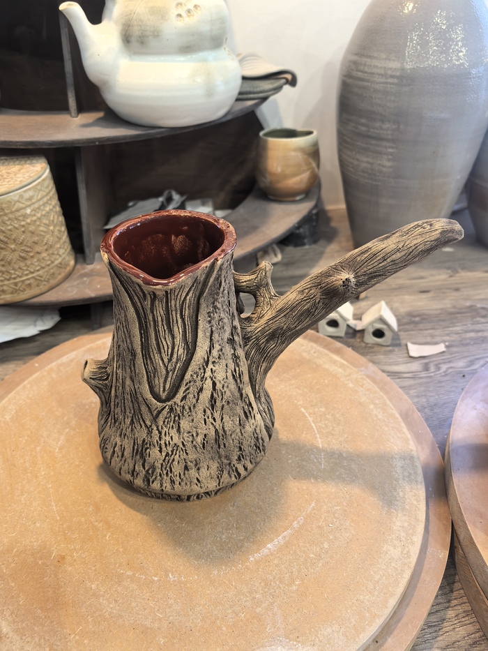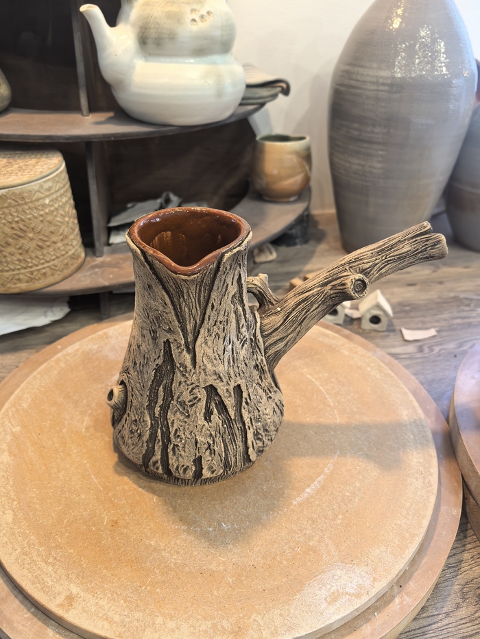 Вообще, заказали мне её одну, но я верен принципу "Заказали одно - лепи три", поэтому сделал три. По тз нужно было повторить эффект молочения, но без молочения, поэтому затирал турки пигментом. Внутри средний слой кислостойкой цветной глазури. На фото видны проплешины, но позже я их закрыл. Просто турки внезапно всем зашли и у меня их расхватали быстро, фотосет сделать не удалось. Обжиги немного нестандартно - на 1000 и 1140 градусов. Т.к. данная масса, несмотря на потолок в 1200 с хвостиком, теряет термоударные свойства при обжиге выше 1140. Как-то так.