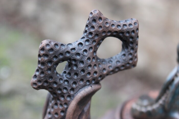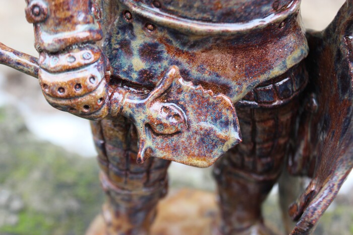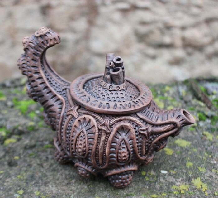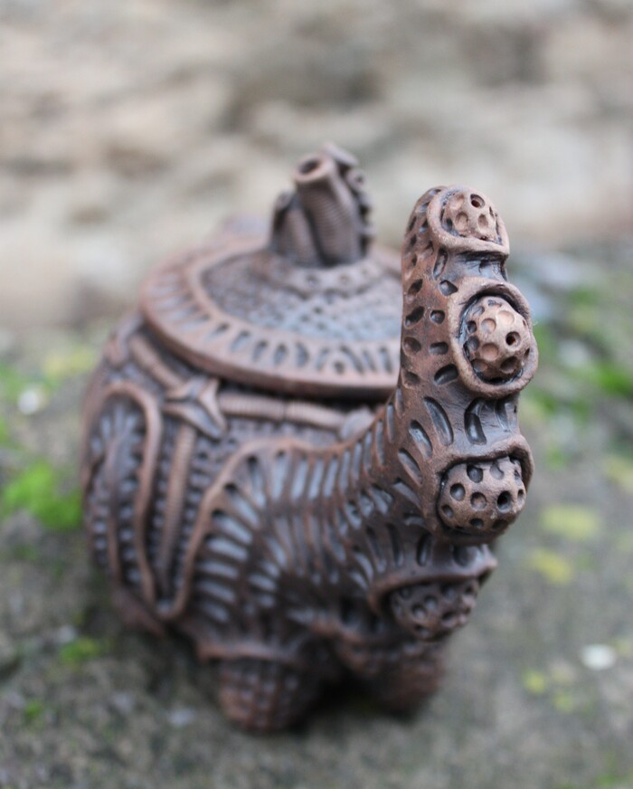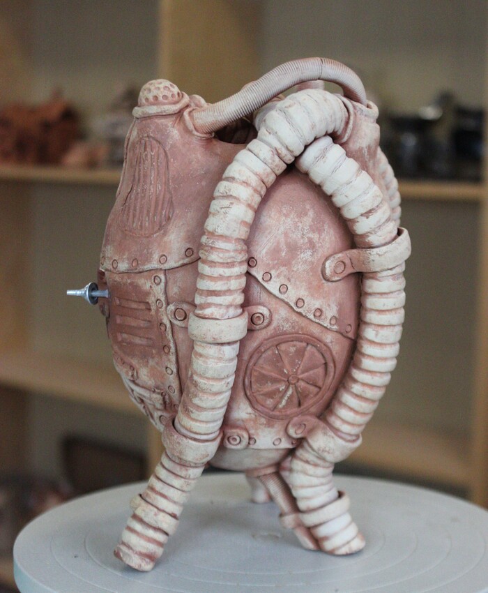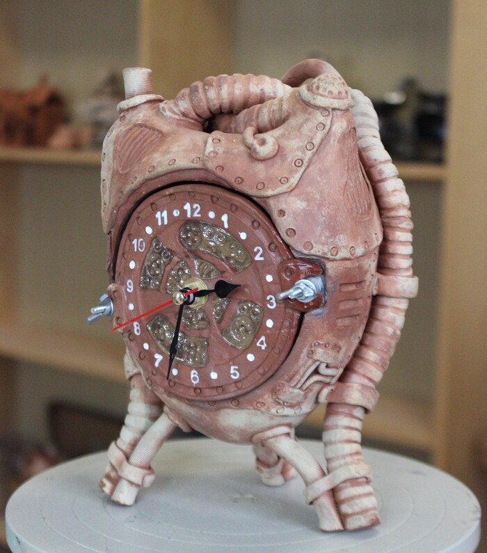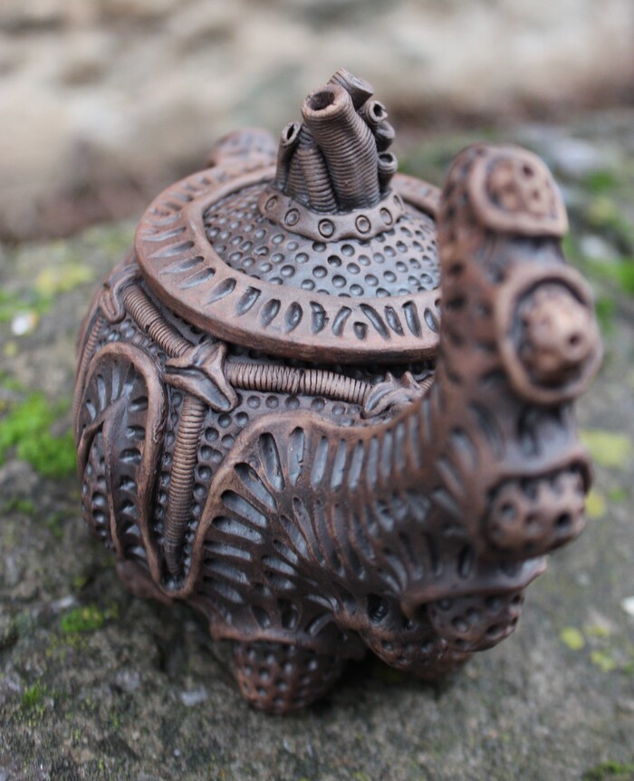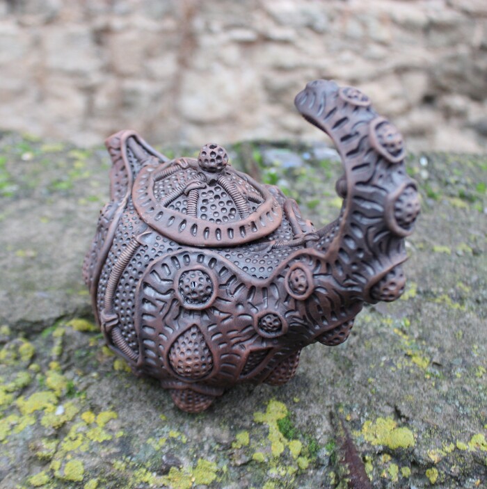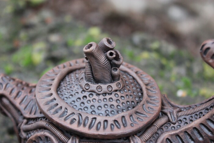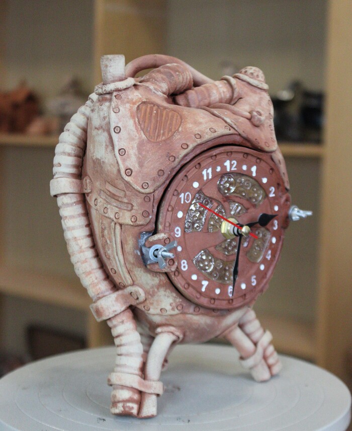 Готовлю серию больших фигурок и шахматных наборов на тайм-панк тематику. В процессе отрабатываю в форме разные идеи. Отдельно интересно в работе, то как повела себя глазурь. Изначально здесь должна была быть матовая прозрачка, но она себя очень плохо показала после обжига - появились мутные разводы и пятна. Спасать ситуацию пришлось эффектаркой "Медь". Результат очень подошёл форме.