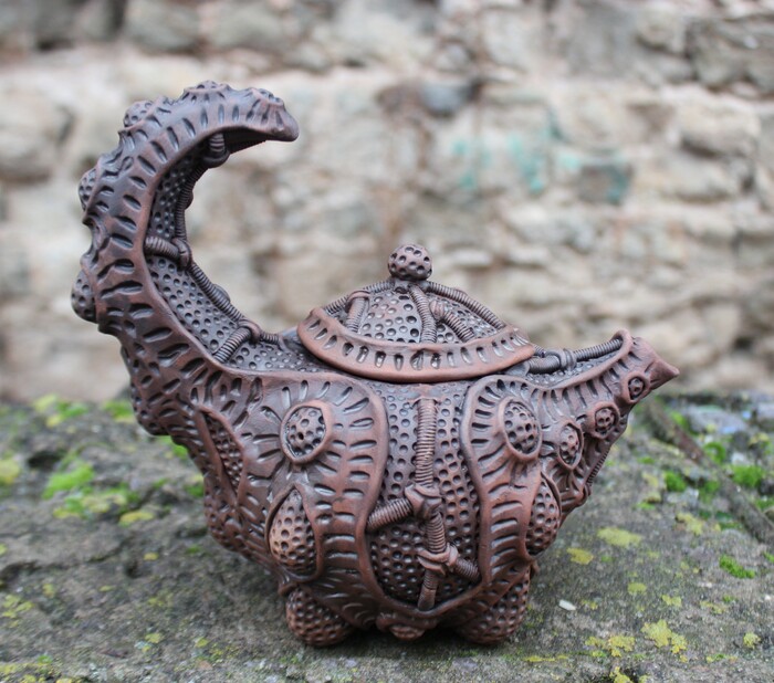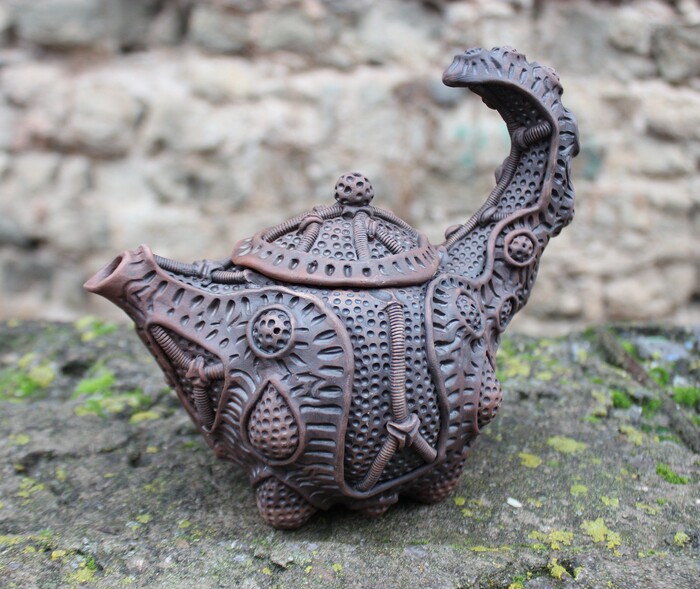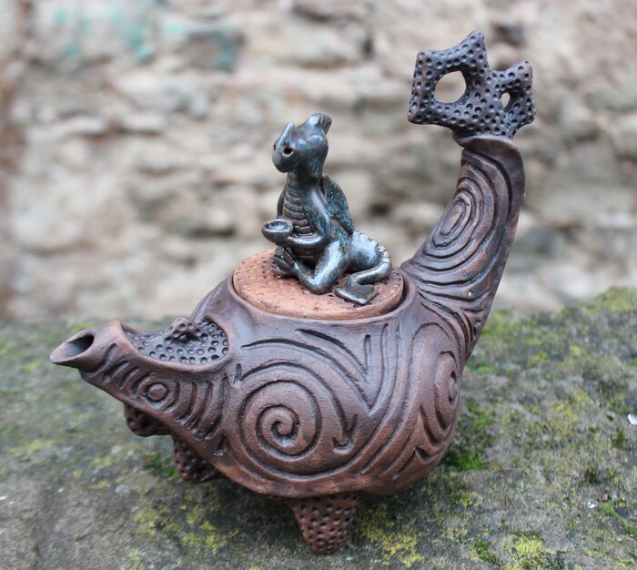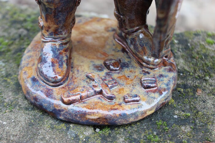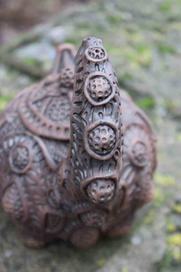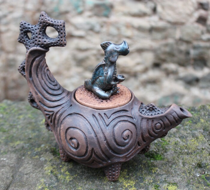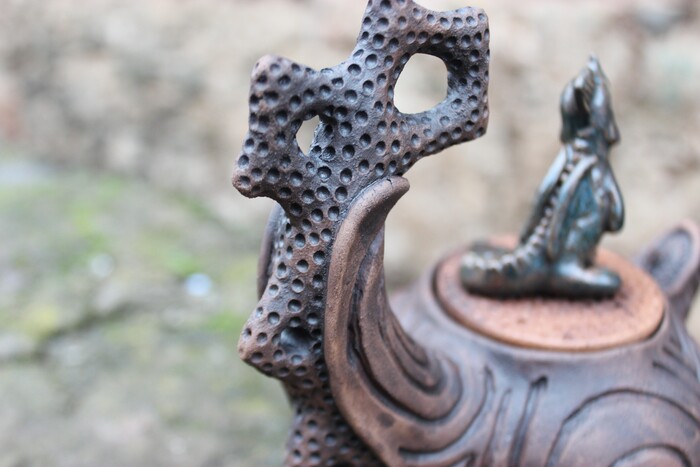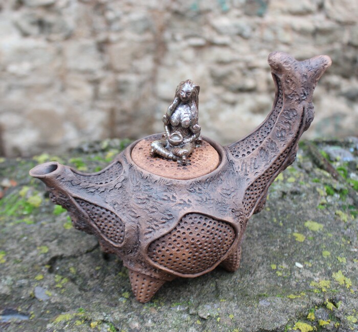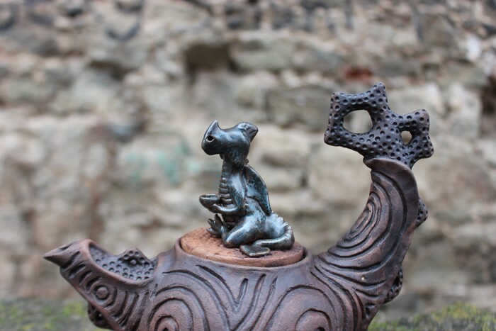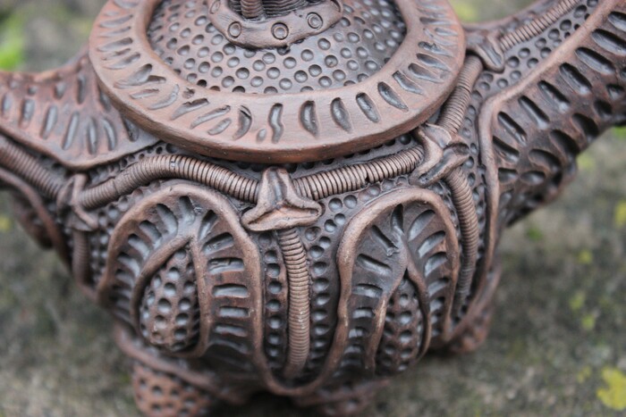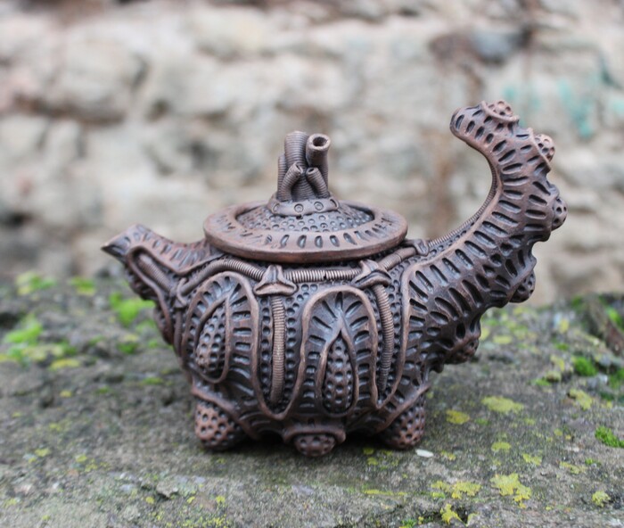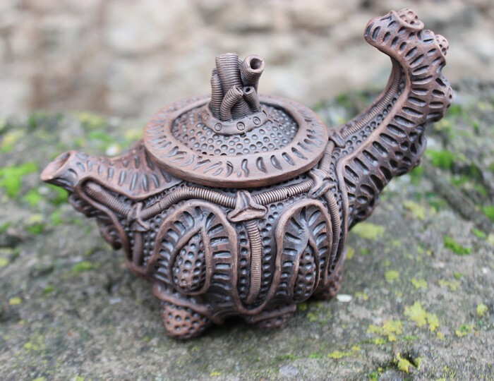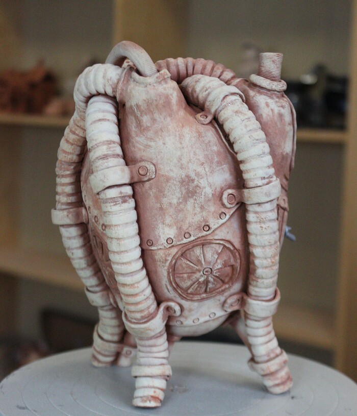 Готовлю серию больших фигурок и шахматных наборов на тайм-панк тематику. В процессе отрабатываю в форме разные идеи. Отдельно интересно в работе, то как повела себя глазурь. Изначально здесь должна была быть матовая прозрачка, но она себя очень плохо показала после обжига - появились мутные разводы и пятна. Спасать ситуацию пришлось эффектаркой "Медь". Результат очень подошёл форме.