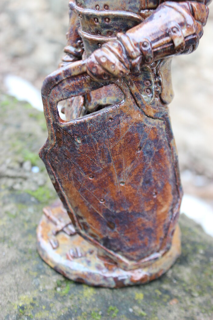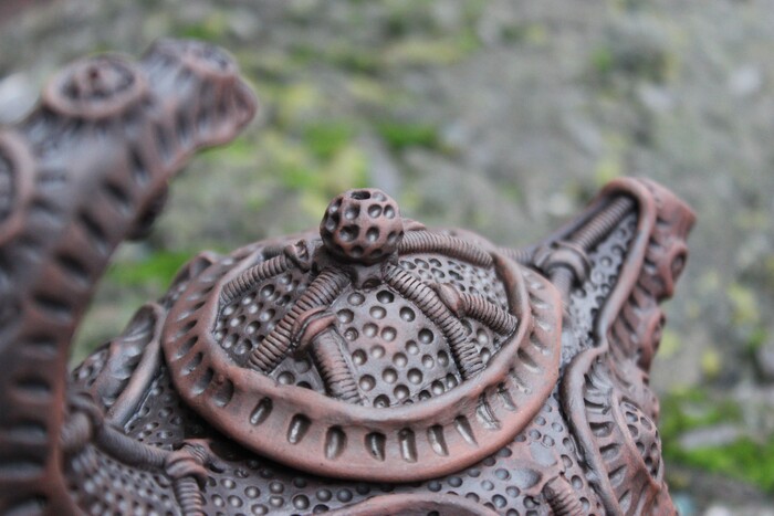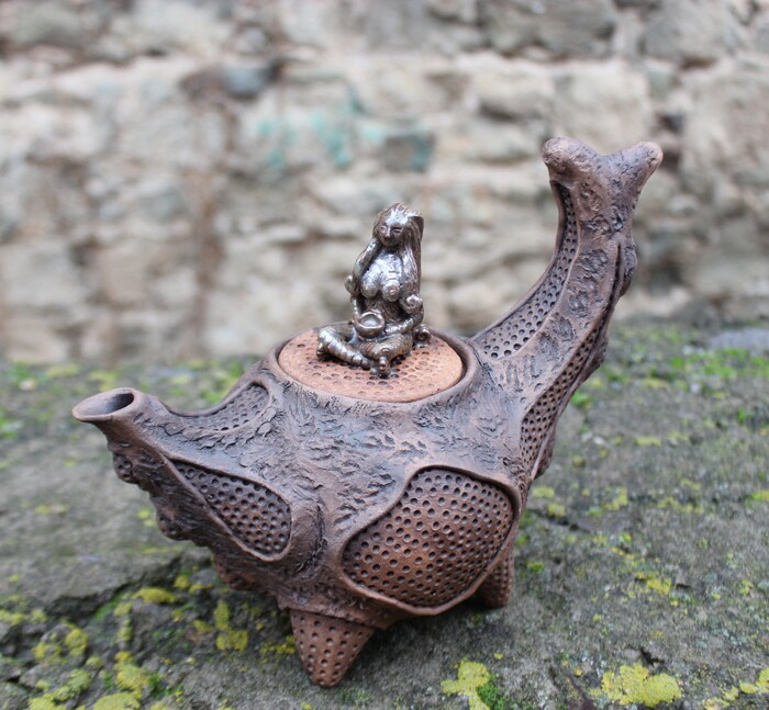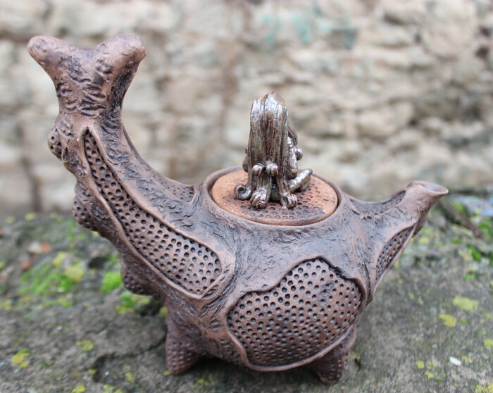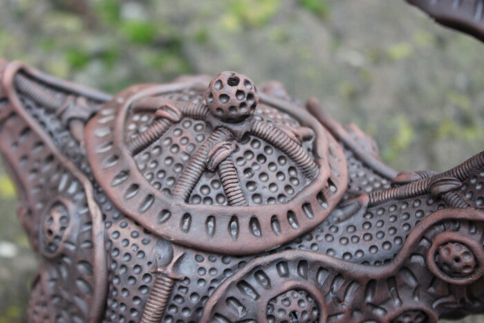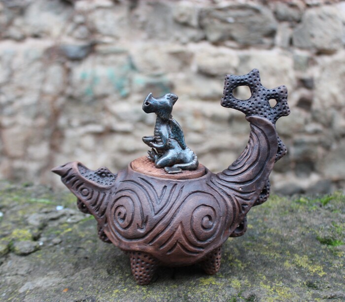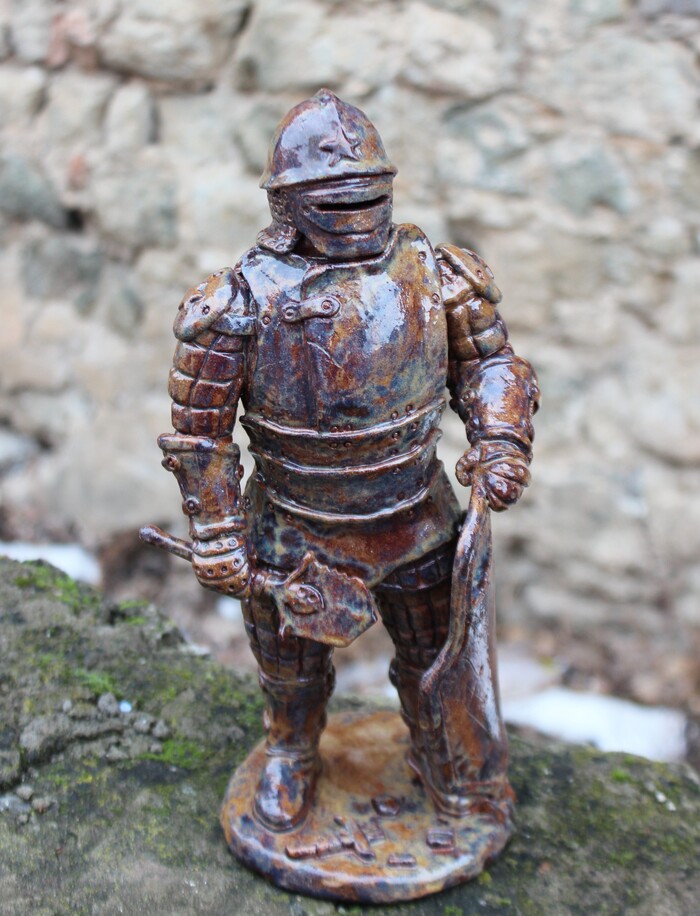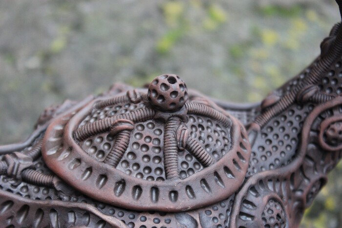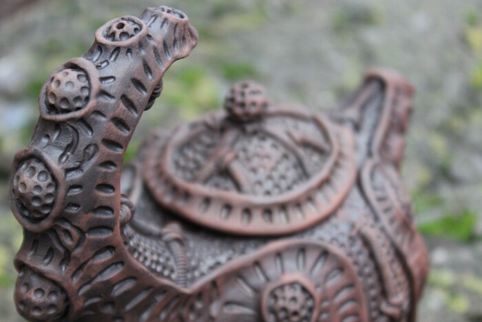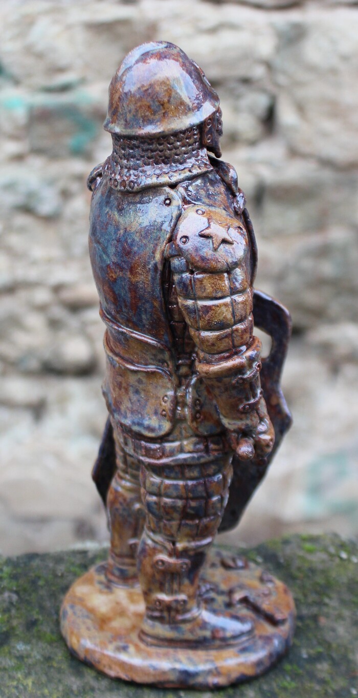 Готовлю серию больших фигурок и шахматных наборов на тайм-панк тематику. В процессе отрабатываю в форме разные идеи. Отдельно интересно в работе, то как повела себя глазурь. Изначально здесь должна была быть матовая прозрачка, но она себя очень плохо показала после обжига - появились мутные разводы и пятна. Спасать ситуацию пришлось эффектаркой "Медь". Результат очень подошёл форме.