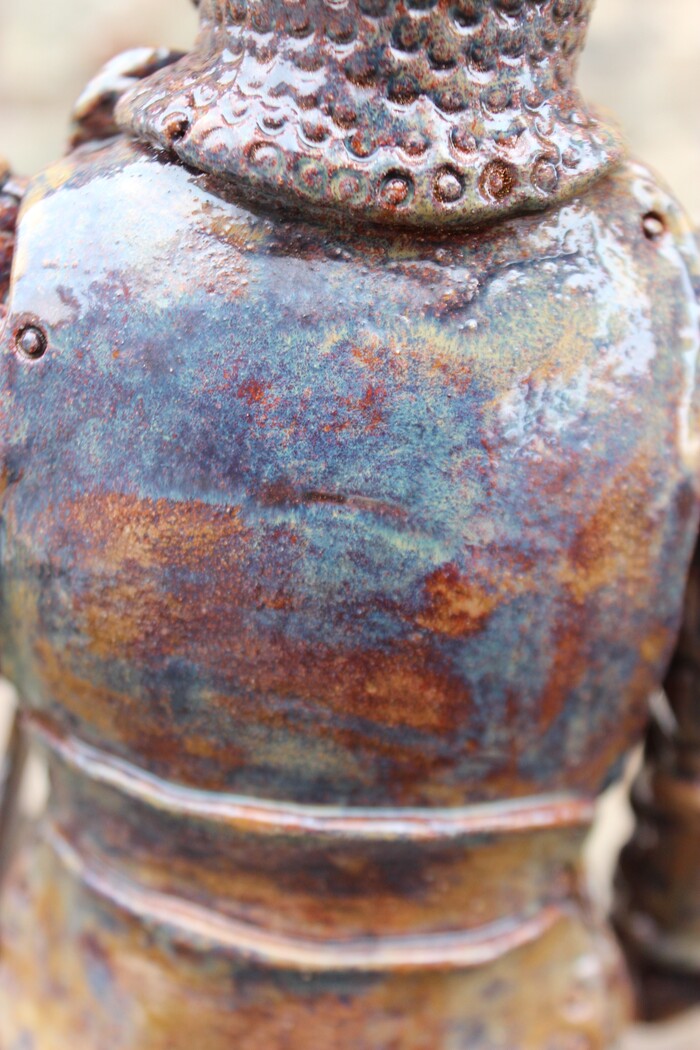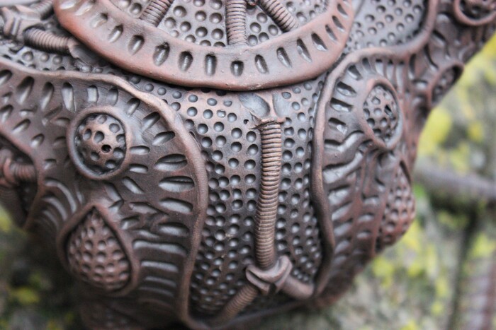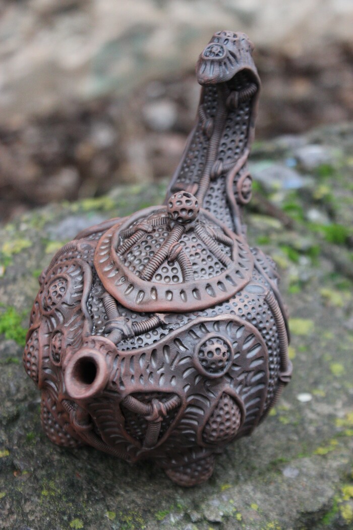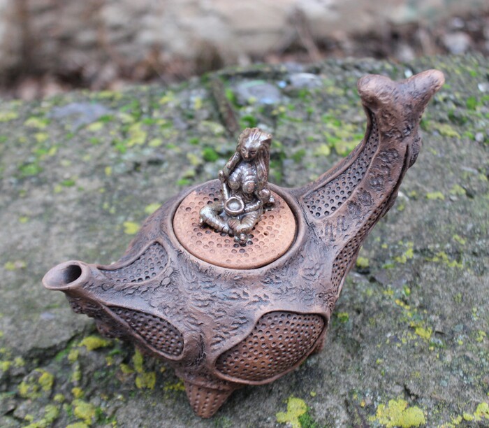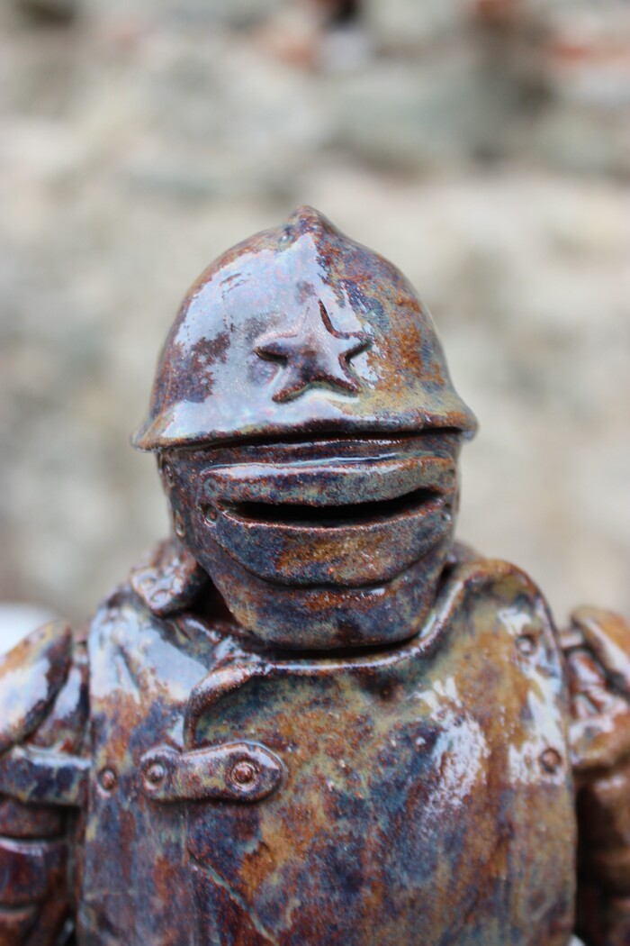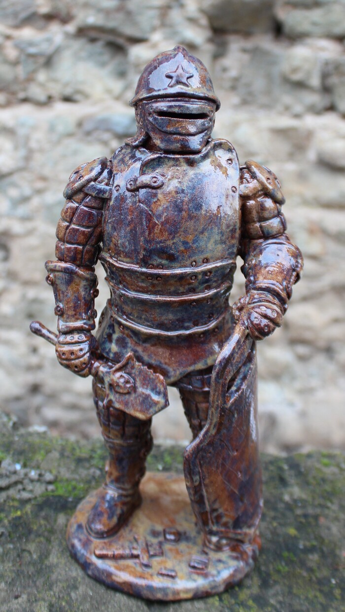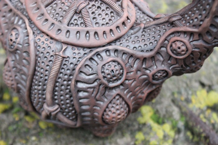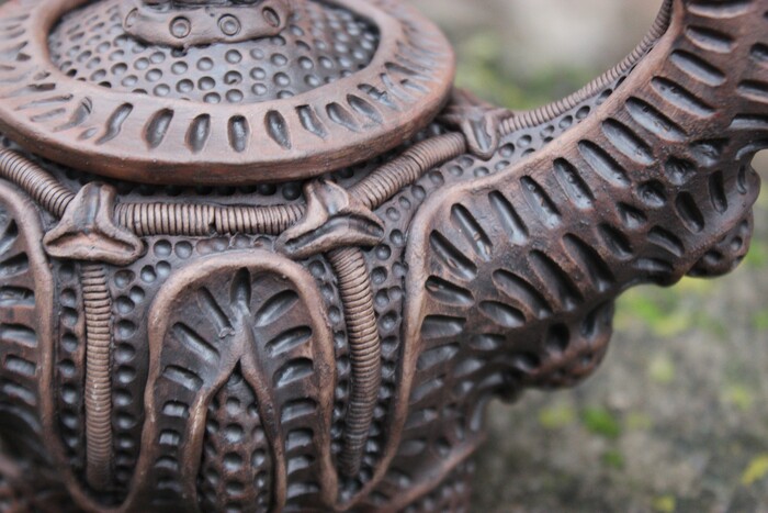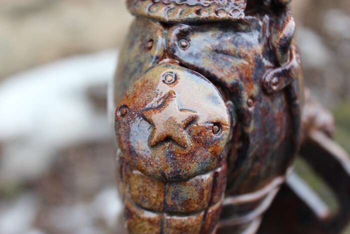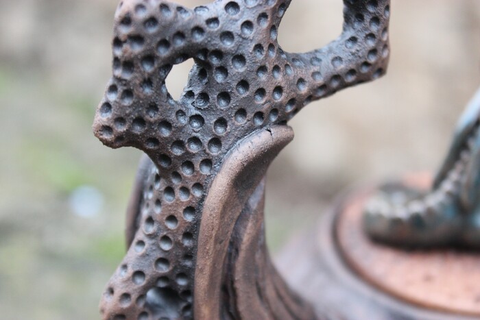 Готовлю серию больших фигурок и шахматных наборов на тайм-панк тематику. В процессе отрабатываю в форме разные идеи. Отдельно интересно в работе, то как повела себя глазурь. Изначально здесь должна была быть матовая прозрачка, но она себя очень плохо показала после обжига - появились мутные разводы и пятна. Спасать ситуацию пришлось эффектаркой "Медь". Результат очень подошёл форме.