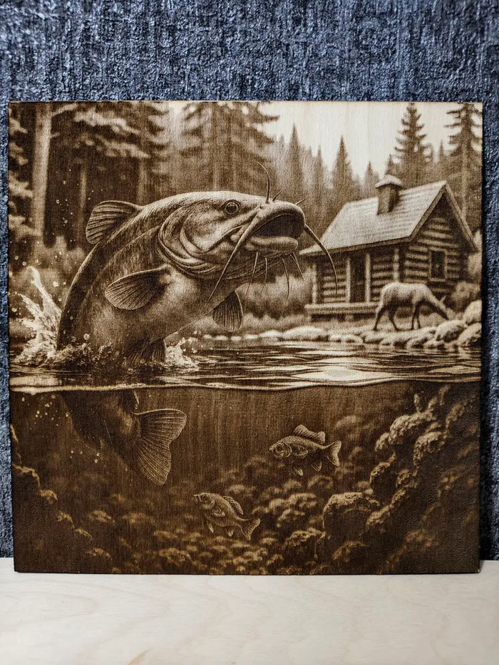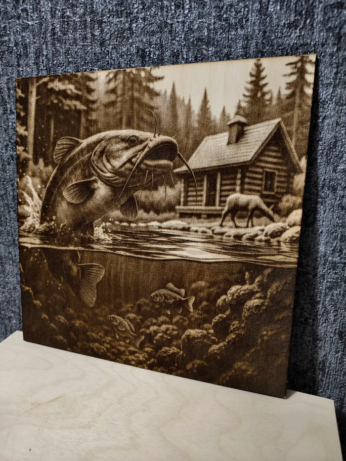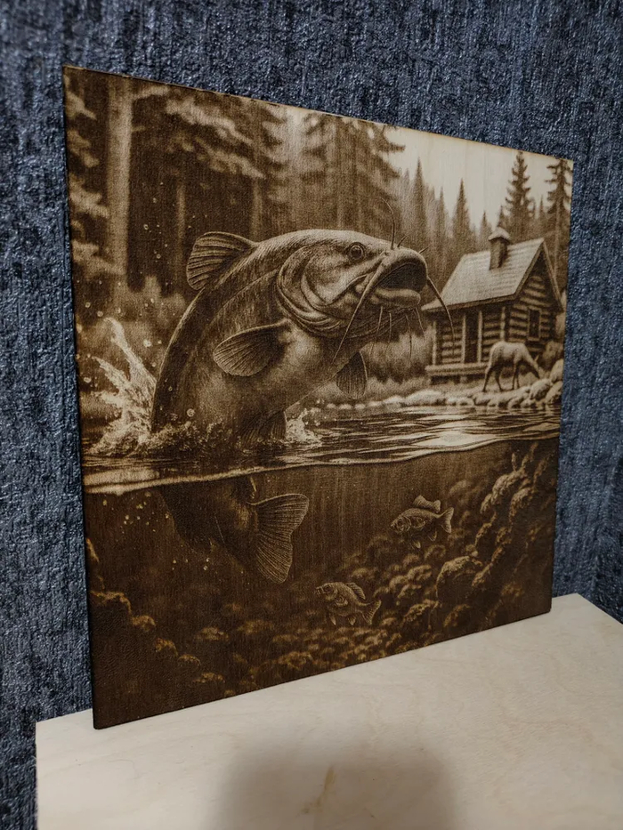 Березовая фанера, гравер с лазером 10 Вт, ретушь не помню кого, кажется Ильдара Насырова, но не факт.
