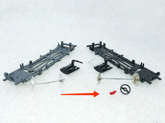 ❌ отломан штырёк у пластиковой детали ходовой системы, который фиксирует переднюю ось;