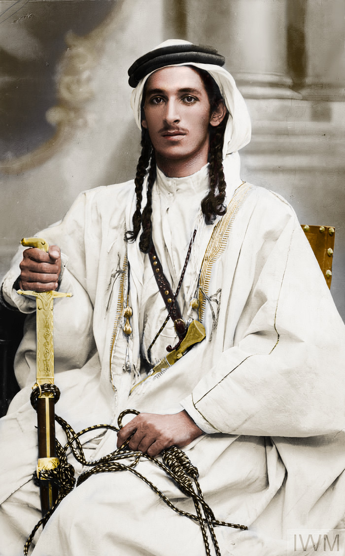 Мохаммед аль Шехери. Он был одним из личных телохранителей Лоуренса Аравийского, позже Абдаллы ибн Хусейна (эмира Трансиордании, ставшего впоследствии первым королём Иордании). Современники его описывали как энергичного и дерзкого человека и неисправимого денди. Фото времён Великого арабского восстания. ≈ 1918 год.