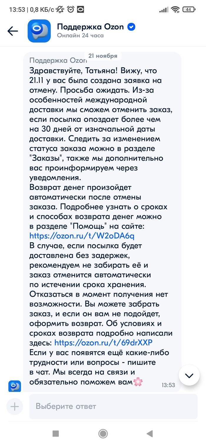 Озону лучше срочно исправить эту систему. Чтобы можно было отказаться в пункте выдачи. И пусть даже возврат через почту России, но я хочу сдать, прислать фото квитанции, тут же получить назад свои деньги и забыть всё как страшный сон. Может и не так страшно будет покупать.
