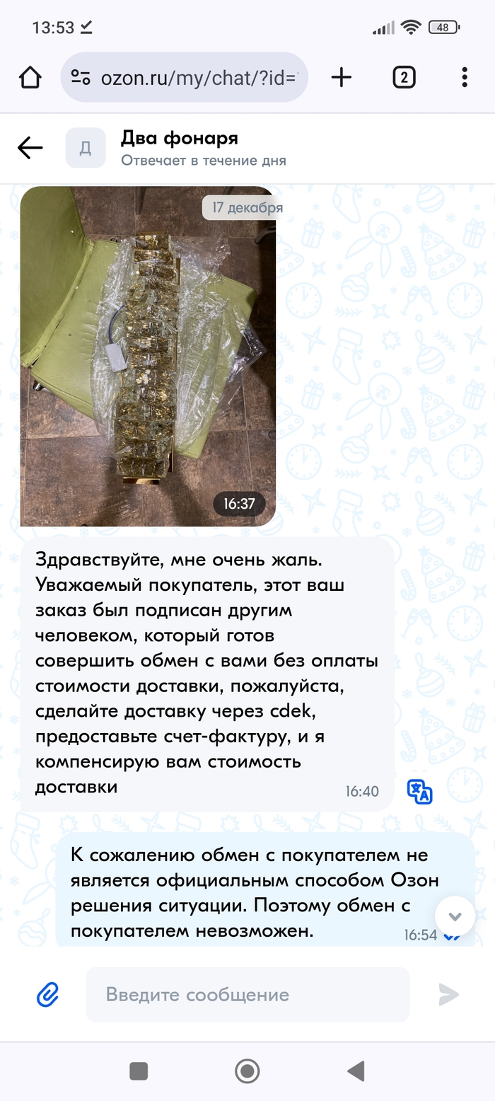 Продавец написал, что уважаемый покупатель (их коронное 😅), ваше бра ушло другому покупателю в России и вы можете с ним обменяться!
