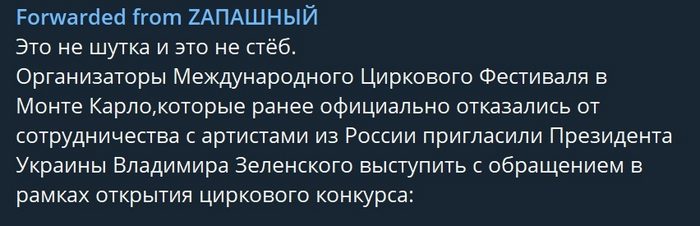 Ответ на пост «Нет, не фейк? Зеленскому предложили выступить "среди своих" на открытии циркового фестиваля в Монако»1