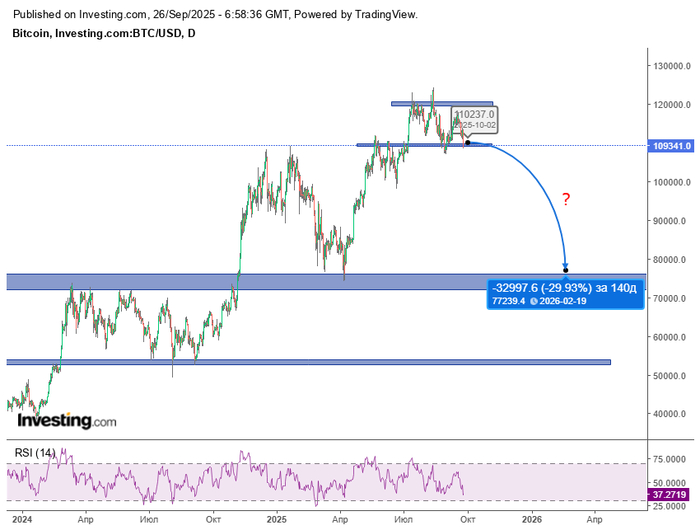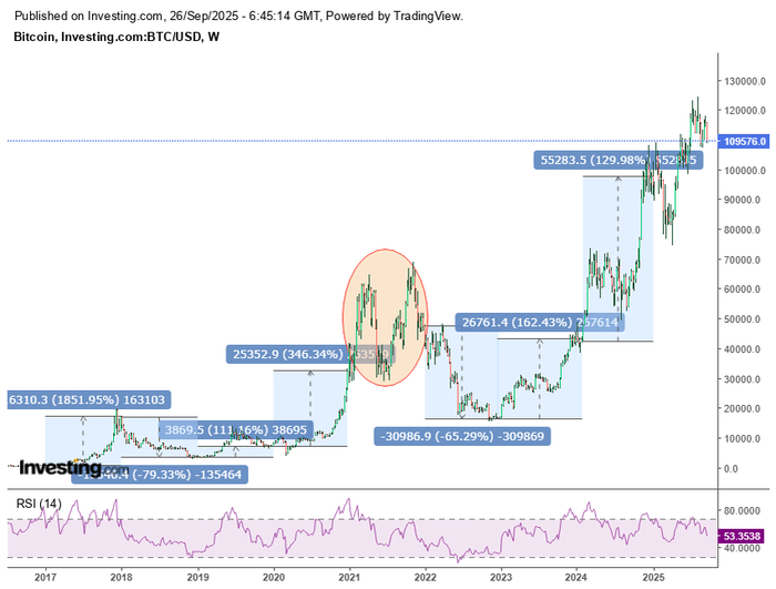 Биткоин нынче популярная штука, поэтому почему бы ему и не вырасти. Но если посмотреть на график Биткоина, то можно заметить одну малозаметную его особенность - высокая волатильность. За последние лет 10, Биткоин за год, либо растёт на 100%+, либо падает на 65%+. Исключением был 2021 год, когда он за это самый год два раза вырос на 100% и два раза снизился на 50%.