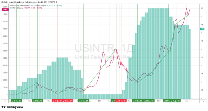 Сопоставив графики ставки ФРС и курса Биткоина, можно заметить, что никакой корреляции у них не наблюдается.
