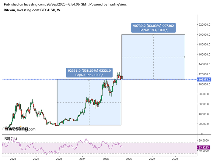 Что характерно, если за предыдущие 1000 дней Биткоин вырос на 538%, то почему за следующий подобный период он вырастет только на 83%?