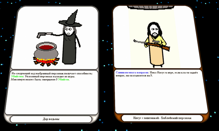 Уж не помню, что меня тогда заставило заморочиться, но к следующему посту Циника я скрафтил гуглдок с наработками и обнародовал его в комментариях. Народ вроде бы проявлял заинтересованность + Циник дал своё одобрение, и тогда я запилил пост с призывом о наборе добровольцев. Люди кидали идеи, предлагали оформление, но больше всего энтузиазма проявлял товарищ под ником @DIMOHA25. Лень пересчитывать, но с половину всех сделанных по итогу карточек придумал именно он(хоть некоторые из них я и считал излишне сложными для игры на поржать). Спустя несколько дней активного творчества мы решили, что для начала карточек достаточно(по итогу их набралось 98 штук, не считая дополнительных), и перешли к визуальному оформлению. За оформление опять же стоит сказать спасибо ему. Именно Димоха нарисовал итоговое игровое поле и дизайн карточек.