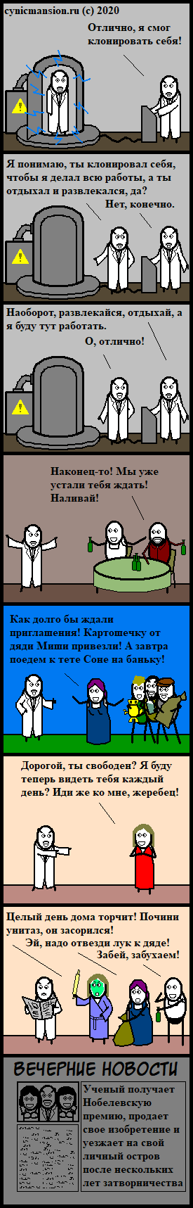 1. CYNICMANSION ВЫХОДИТ ИЗ ХИАТУСА! Навсегда ли, я сказать не могу. Но могу сказать, что гарантирую по два выпуска в неделю как минимум на полтора-два месяца, а там посмотрим. Так что стряхивайте пыль с кос и Мишань, собираемся обратно! Несите весть по деревням и селам! Сообщите маме, папе и бабушке! Дедушке не надо, ОН УЖЕ В КУРСЕ! Все, кто хочет отпраздновать выход циника из хиатуса могут смело засылать деньги в мой одобренный модераторами кошелек