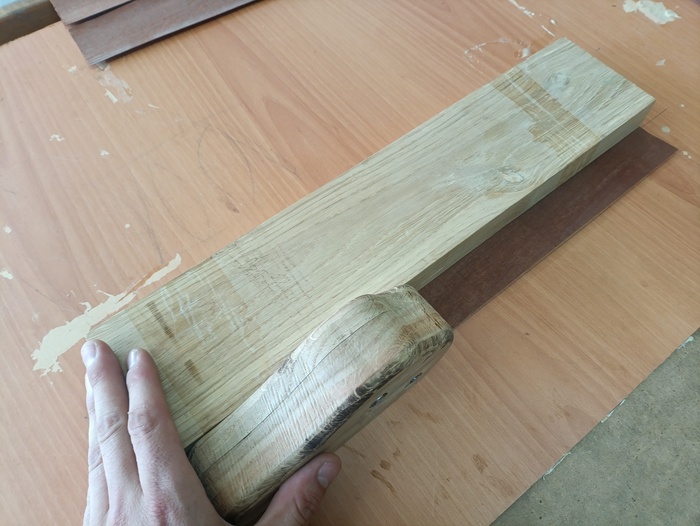 Короче, не помню откуда, а как-то появился этот инструмент. Хотели выкинуть. Покрутил я его в руках... подумал, а чоэта на дрова, тем более что не было у меня шерхебля, будет анструмент, рукам приятный да глаза радующий! Отпилил ненужное, ну и вот.