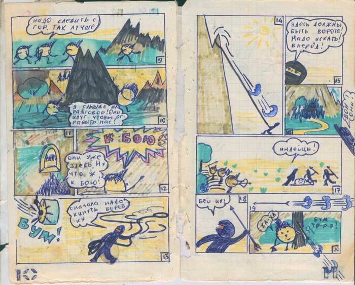 Но зато в этом номере я начал рисовать свой комикс "Приключения индейцев". Всем же известно, что у индейцев есть особенная пещера, битком набитая золотом и драгоценностями. В моём комиксе за этим сокровищами отправились ниндзя. Индейцы против ниндзя - что может быть лучше?