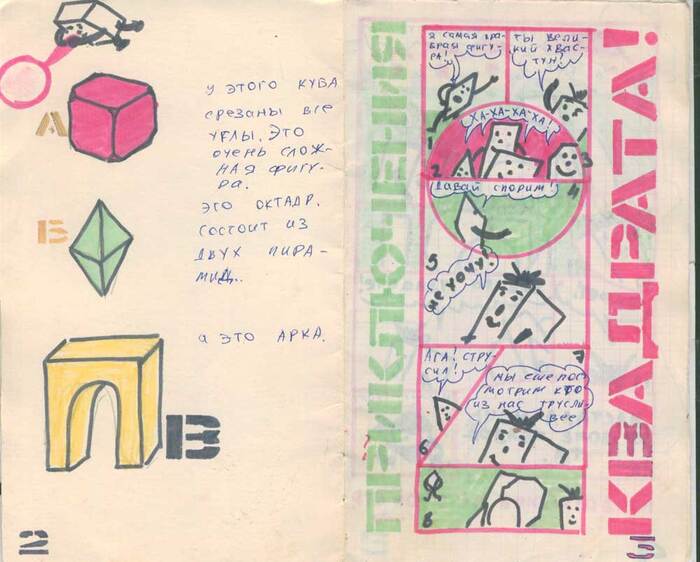 В 8м классе увлёкся геометрическими фигурами и даже начал делать рукописный журнал "Квадрат", главной фишкой которого были развёртки фигур на развороте. Развёртки можно было вырезать и склеить объёмные фигуры.
