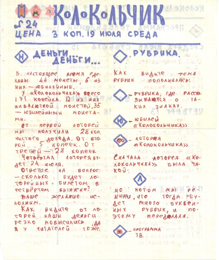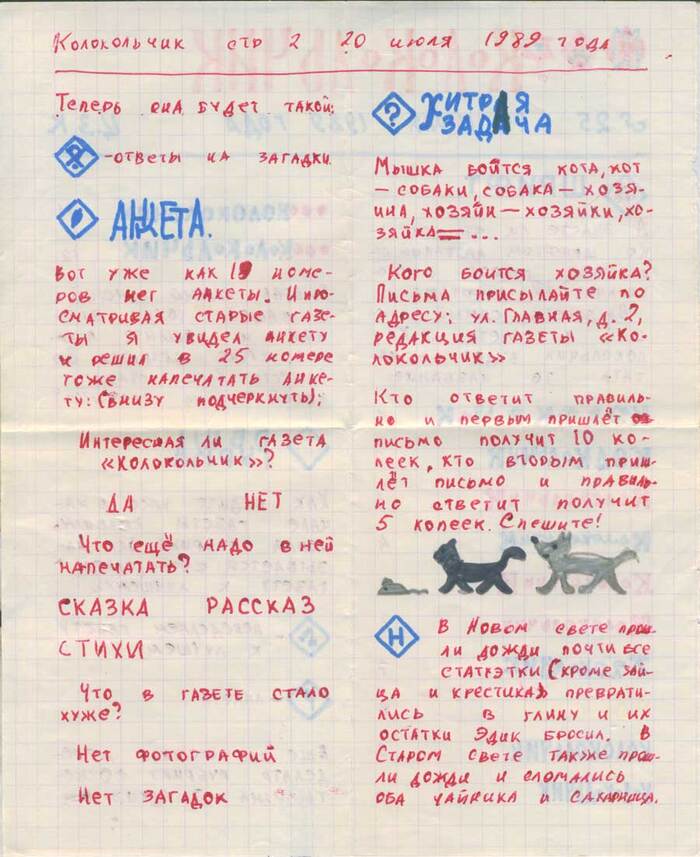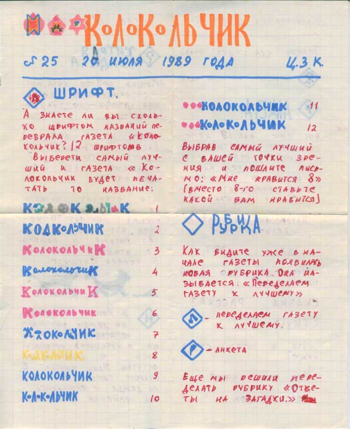 Дисклеймер. Хроники нашего детского мира с пруфами. Детская рукописная газета "Колокольчик", 1989 год. В 12 лет я выпускал газету. Объём - обычный тетрадный лист в клетку. Старался, чтобы газета как можно больше походила на настоящую: оформление, заголовки, печатные буквы, колонки и пр.