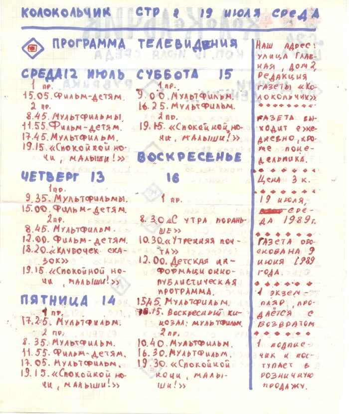 На 2-й странице газеты приведена программа передач советского телевидения. Программа печаталась по просьбе читателей, печаталась не целиком, а только детские передачи и фильмы, а также мультфильмы. То, что программа на 12-16 июля, а сама газета датирована 19 июля, означает, что я выпускал газету наперёд. То есть чисто по детски: в порыве вдохновения взял и выпустил в один день пяток номеров, а потом забросил это дело и целую неделю ничего не делал. А потом - снова за дело!