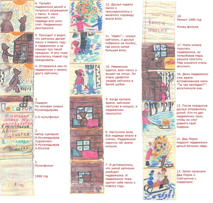 Мультфильм Подарок. Рисовал по сказке собственного сочинения. Длина - 18 кадров, нумерация снизу вверх. К каждому кадру написал комментарий, чтобы было понятно, что вообще происходит. По начальному и конечному кадру можно увидеть, что мультфильм повидал виды, и в 1990 году я провёл небольшую реставрацию картины.