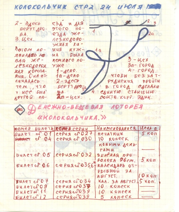 На 2-й странице - розыгрышная таблица моей 4-й денежно-вещевой лотереи. Я писал лоторея, потому что полагал, что проверочное слово лото. Выигрышными были 50% билетов. Среди призов: деньги (игрушечные), зелёная проволока, отрывной календарь на август (самодельный), обычный календарь на август (тоже самодельный).